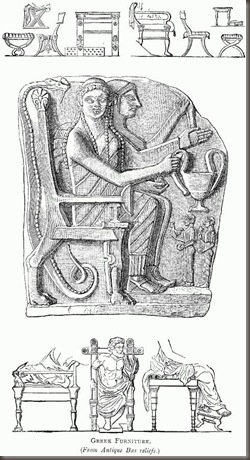 An early reference to Greek furniture is made by Homer, who describes coverlids of dyed wool, tapestries, carpets, and other accessories, which must therefore have formed part of the contents of a great man's residence centuries before the period which we recognise as the "meridian" of Greek art.